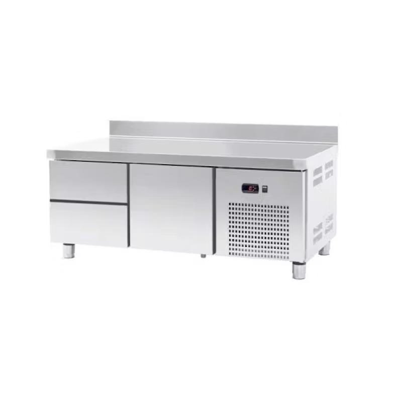 Bajo Mostrador Refrigerador GN1/1 Fondo 700 mm Altura 600 mm con 2 Cajones Descripción: El bajo mostrador BMRESP-135B-2 es un equipo diseñado para optimizar el espacio en cocinas profesionales, combinando la funcionalidad de una superficie de trabajo con un eficiente sistema de refrigeración. Su altura de 600 mm lo hace ideal para servir de soporte a aparatos de cocción y preparación, creando un flujo de trabajo más cómodo y ergonómico.