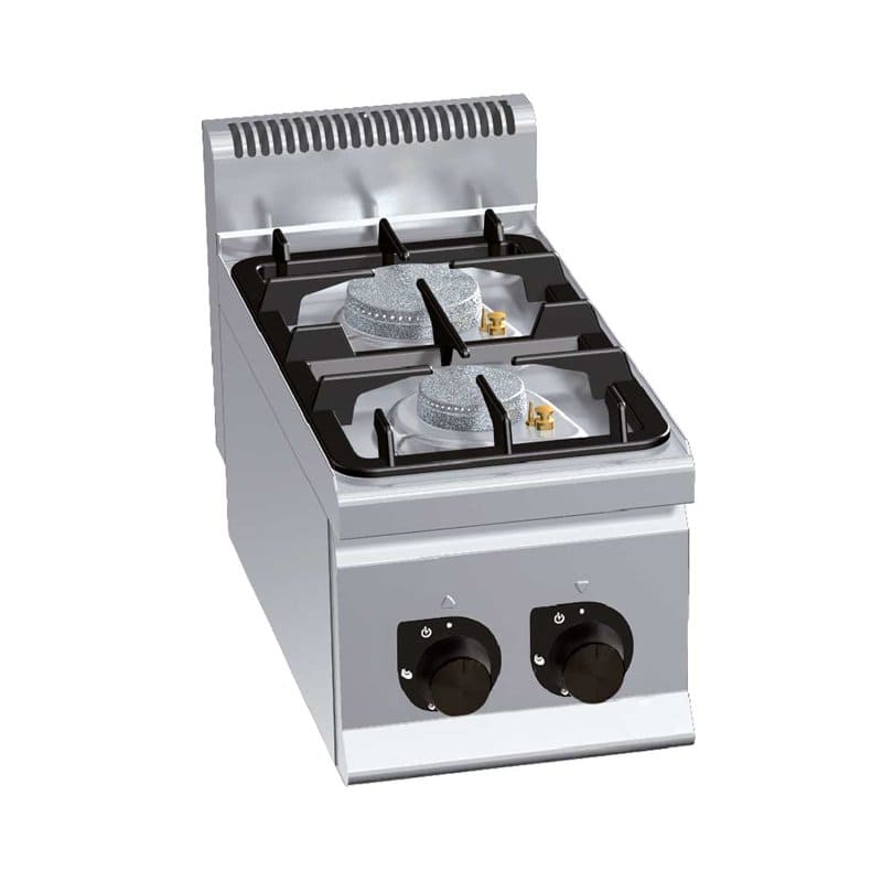 Alto Rendimiento Compacto: Ofrece una potente salida de 10,5 Kw desde sus 2 quemadores de hierro fundido niquelado (simple y doble corona), todo en un formato de sobremesa (400×714×290 mm).