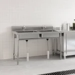 Fregadero industrial de acero inoxidable con doble seno extraprofundos (20 cm), ideal para cocinas profesionales en restaurantes, hoteles y colectividades. Resistente a golpes y arañazos, apto para el contacto con alimentos y fácil de limpiar gracias a su superficie antihuellas y antimanchas. Incorpora salpicadero trasero para mayor higiene y estabilidad, y es fácil de montar y mover.