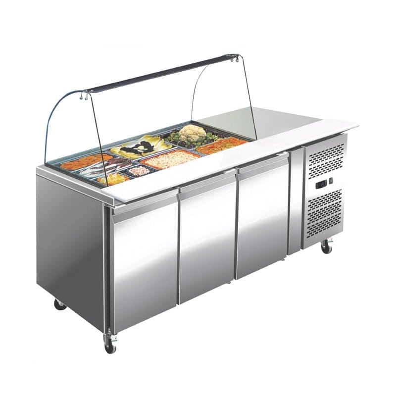 Mesa de preparación refrigerada con hueco para cubetas y cristal curvo de 465 litros