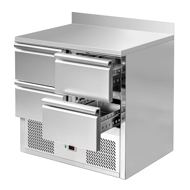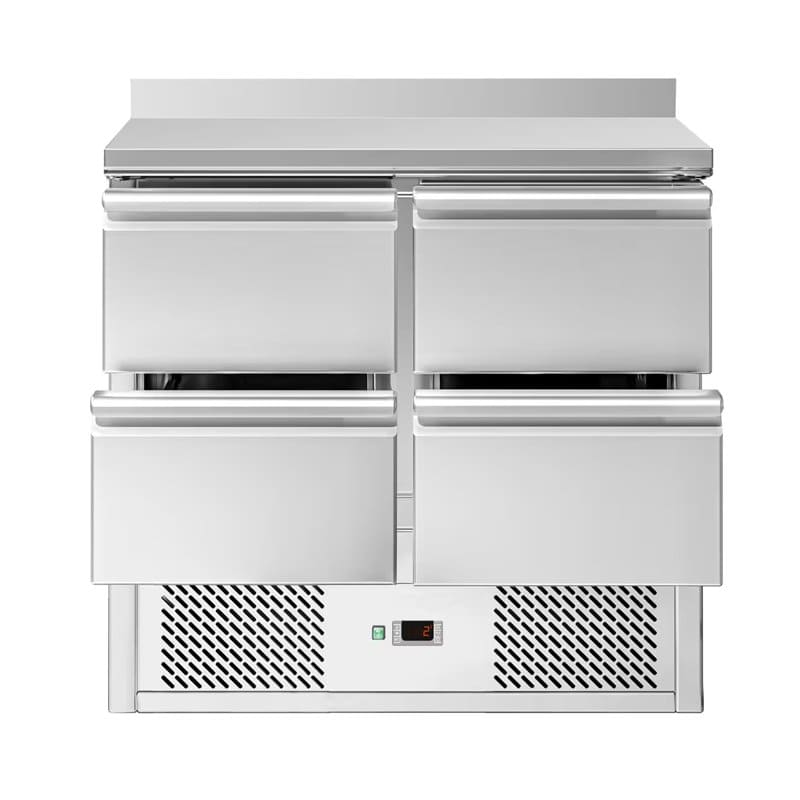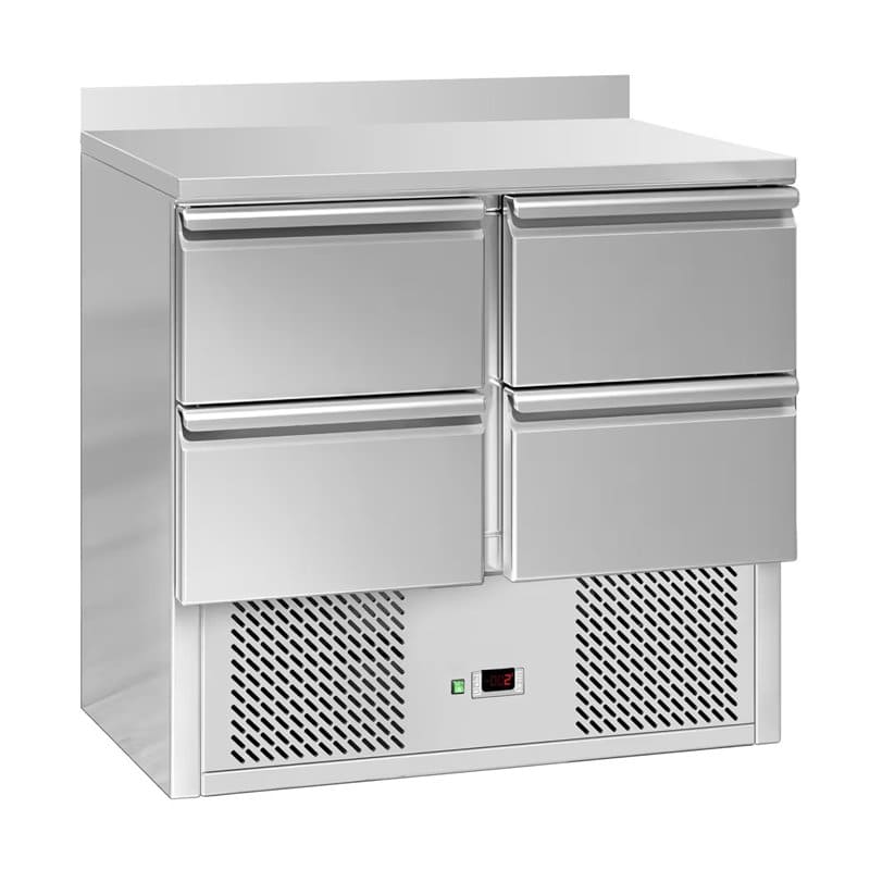 Esta mesa refrigerada MP90C4C tiene una capacidad de 257 litros, con 4 cajones y una temperatura regulable de +2° / +8°C gracias a su refrigeración con enfriamiento ventilado forzado (no frost).