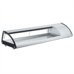 Vitrina expositora de tapas con cristal curvo y tapa abatible VTSB6BR, diseñada para presentar alimentos de forma atractiva y accesible en bares, restaurantes y cafeterías. Su diseño elegante y curvado realza la visibilidad del producto, mientras que su estructura alargada permite organizar las preparaciones de manera ordenada y profesional.