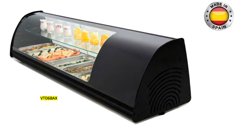 Con una capacidad para 6 bandejas GN1/3×40 (incluidas), esta vitrina mantiene una temperatura constante entre +2 °C y +6 °C gracias a su sistema de enfriamiento forzado (no frost). Además del área refrigerada, cuenta con un estante intermedio (neutro) de cristal templado, que aumenta su capacidad de exhibición.