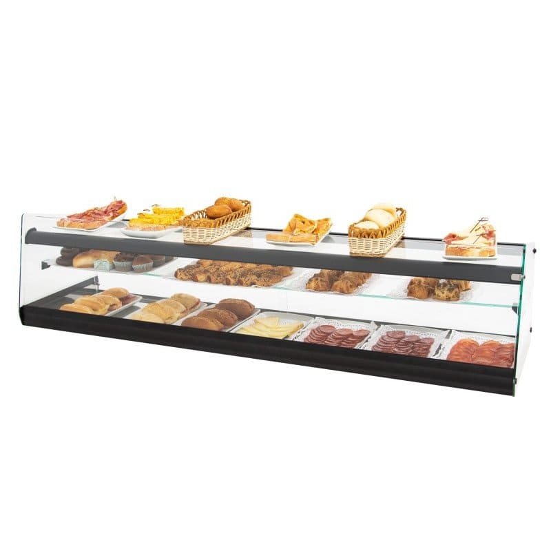Con una amplia superficie superior de cristal templado, esta vitrina puede ser utilizada como encimera adicional. Fabricada en acero inoxidable AISI-304 de alta calidad, la vitrina ofrece durabilidad y una base higiénica para la exposición de alimentos.